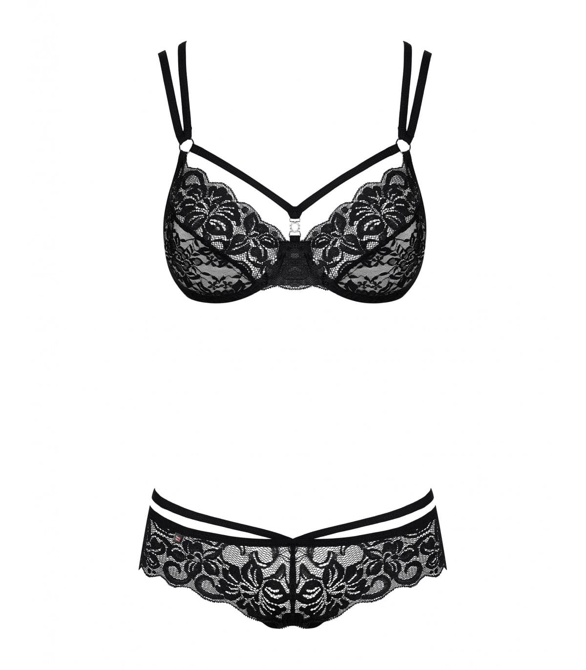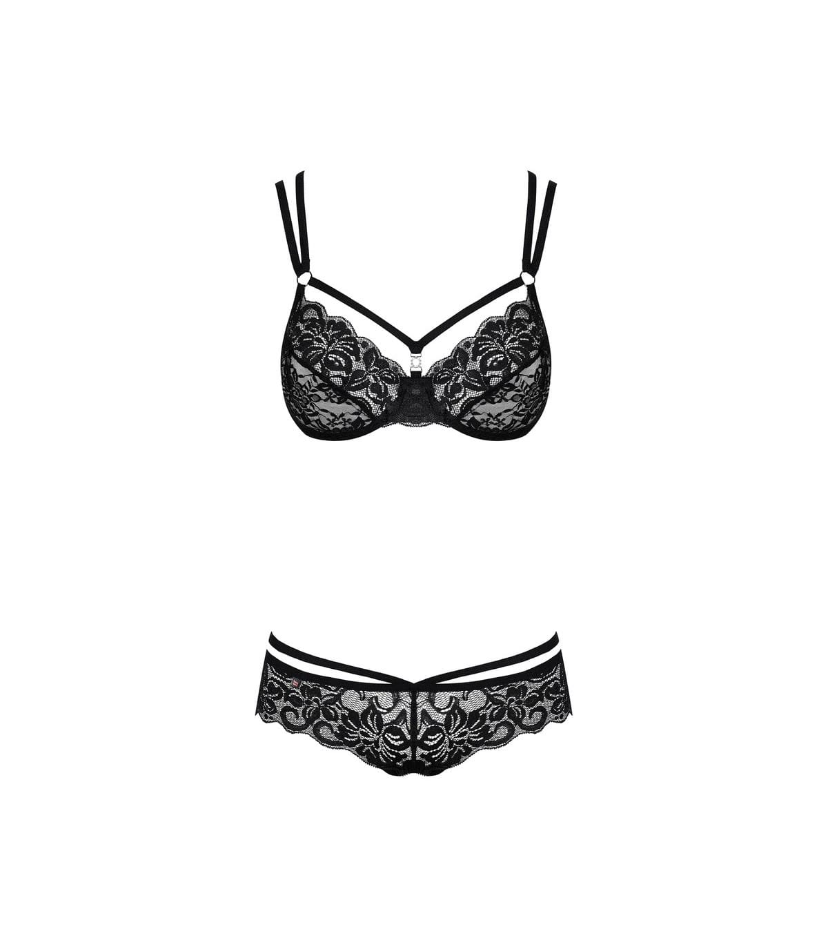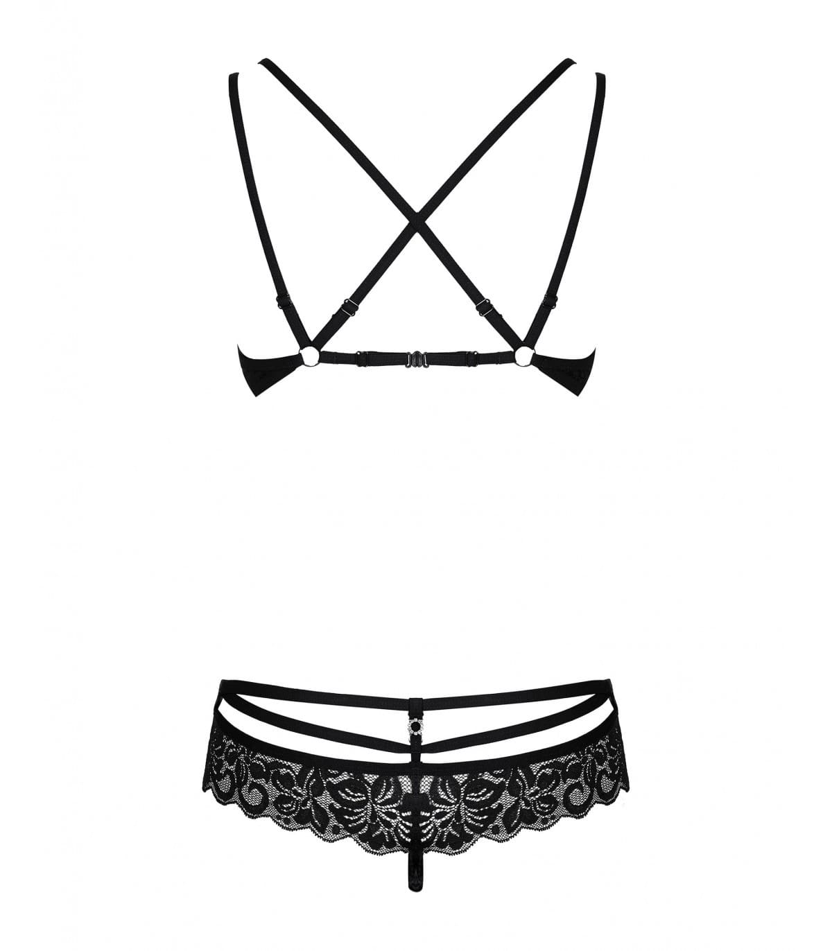 ¿Qué tal un negro atemporal, correas intrigantes y detalles brillantes? Estos son los elementos del atrevido y extremadamente sexy conjunto 860-SET-1. Este efecto único está garantizado por las correas que envuelven todo el cuerpo. cuerpo realzan las caderas y realzan el busto. Están intrincadamente cruzados en la espalda, tanto en el sujetador como encima de la braguita. El conjunto está rematado con un encaje delicado y sensual que le dará elegancia y elegancia.
