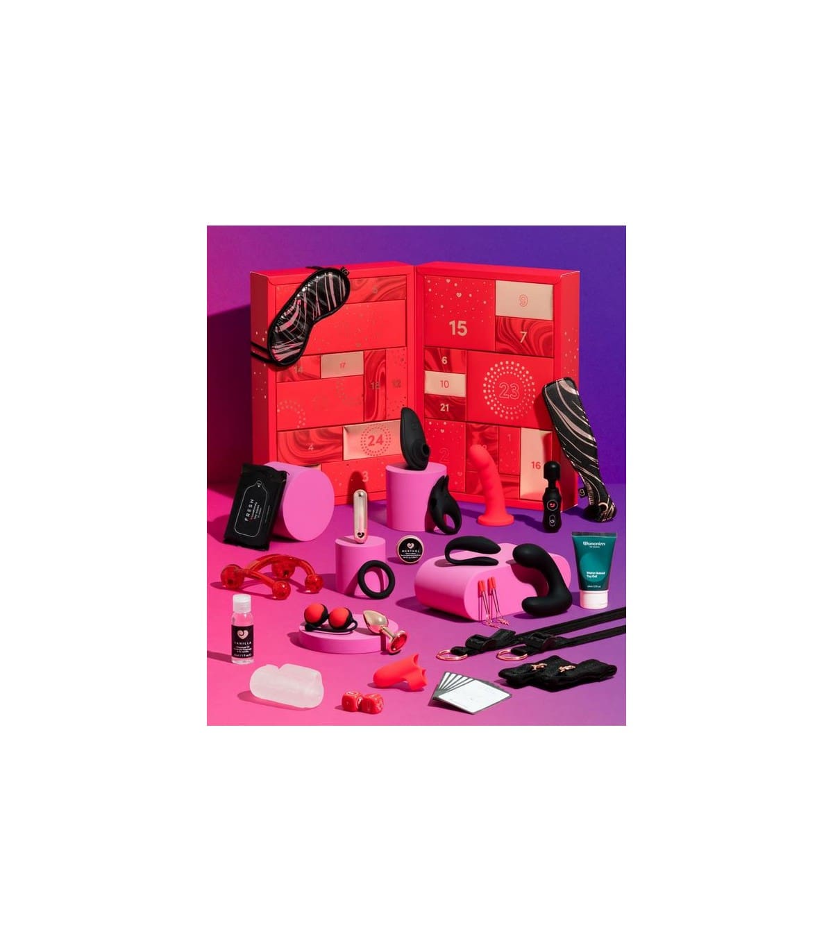 Calendario de adviento formado por 24 casillas en el que incluyen vibradores, masajeadores, succionadores, juguete con APP, artículos de BDSM…