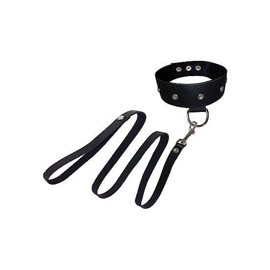 LEATHER LEASH AND COLLAR Correa y collar de cuero, confortable y ajustable con velcro. La correa mide un metro de largo. El mejor complemento para tus juegos de bondage.