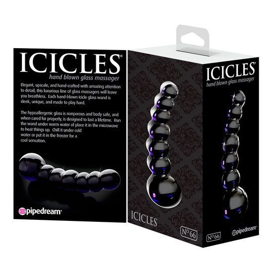 ICICLES NUMBER 66 HAND BLOWN GLASS MASSAGER. Este elegante varita de cristal cuenta con un eje de cuentas graduado, lo que le permite aliviar cómodamente en su tamaño. La textura de bulbo es perfecto para la penetración, y hábilmente curvado para explosivo punto G y P-Spot estimulación. El vidrio es hipoalergénico y seguro para el cuerpo, y siempre que se use adecuadamente durará toda la vida. Recomendamos mojarlo con agua tibia o ponerlo en el microondas para una sensación más cálida. También puedes enfriarlo con agua fría o ponerlo en el congelador para una sensación de frescor. Ya que el vidrio no es poroso, su limpieza es muy fácil. Usa el limpiador Pipedream Toy Cleaner y agua tibia, o incluso puedes meterlo en el lavavajillas para mayor comodidad después de la diversión. Medidas insertables: 9 x 2 cm