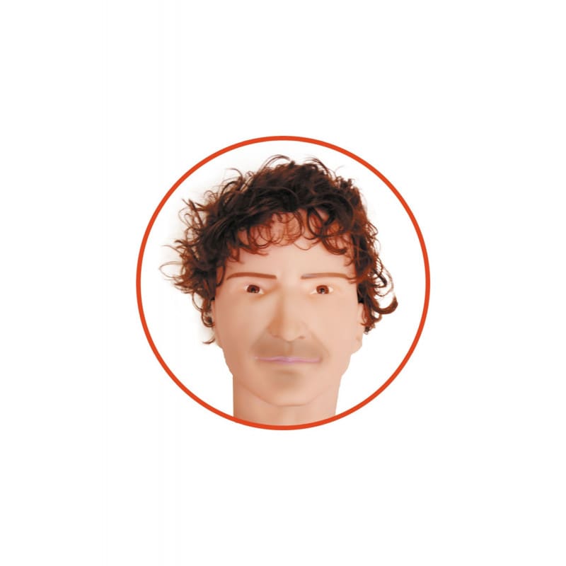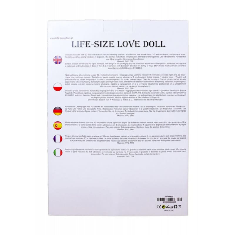 Muñeco de amor hinchable con cara, manos y pies en 3D, con pelo natural y posición de pie. Es de tamaño natural, tiene un torso masculino, pies y manos en 3D y brazos móviles.