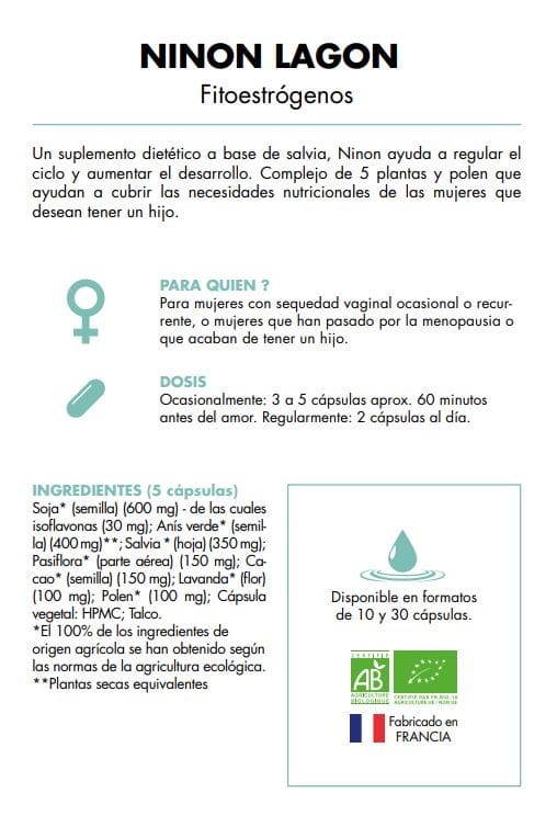 Un suplemento dietético a base de salvia, Ninon ayuda a regular el ciclo y aumentar la floración. Complejo de 5 plantas y polen que ayudan a cubrir las necesidades nutricionales de las mujeres que desean tener un hijo. A base de salvia, Ninon Lagoon Claude Aphrodisiacs está formulado para ayudar a las mujeres que sufren de sequedad vaginal recurrente o puntual.