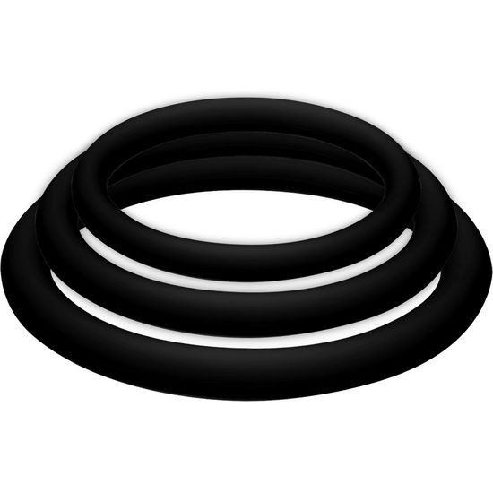 POTENZPLUS BLACK, SET OF 3 (S, M, L) Potenz Plus, 3 anillos para el pene, fabricados con silicona médica, te permitirá experimentar una rigidez insospechada y una sensación de placer duradero para ti y tu pareja. Medidas de diámetro. S: 3,5 cm M: 4 cm L: 4,5 cm. Contiene un sobre de lubricante Aquaglide.