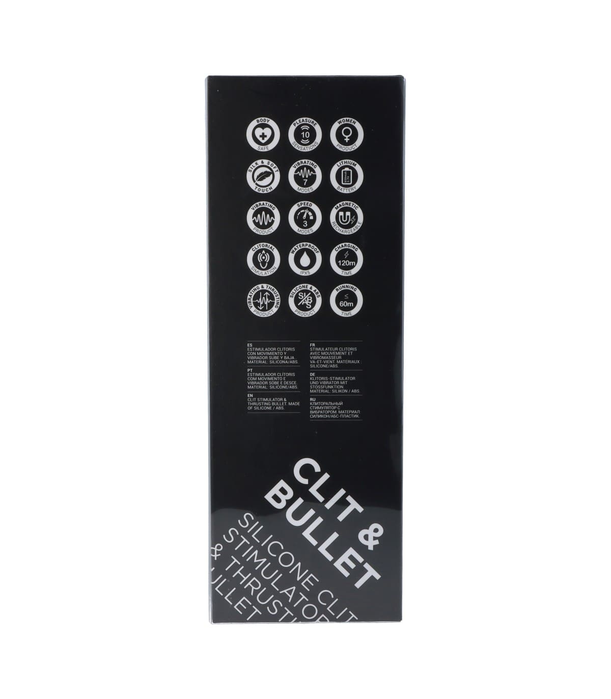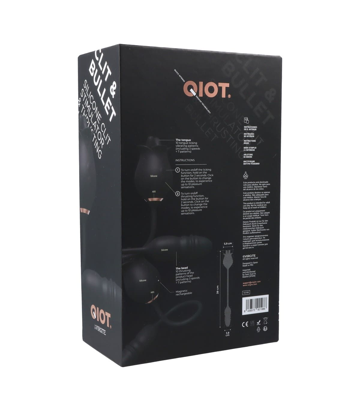 – Medidas: 39 cm de largura total / 5’9 cm de anchura estimulador clitoriano / 3’8 cm de anchura estimulador vaginal.