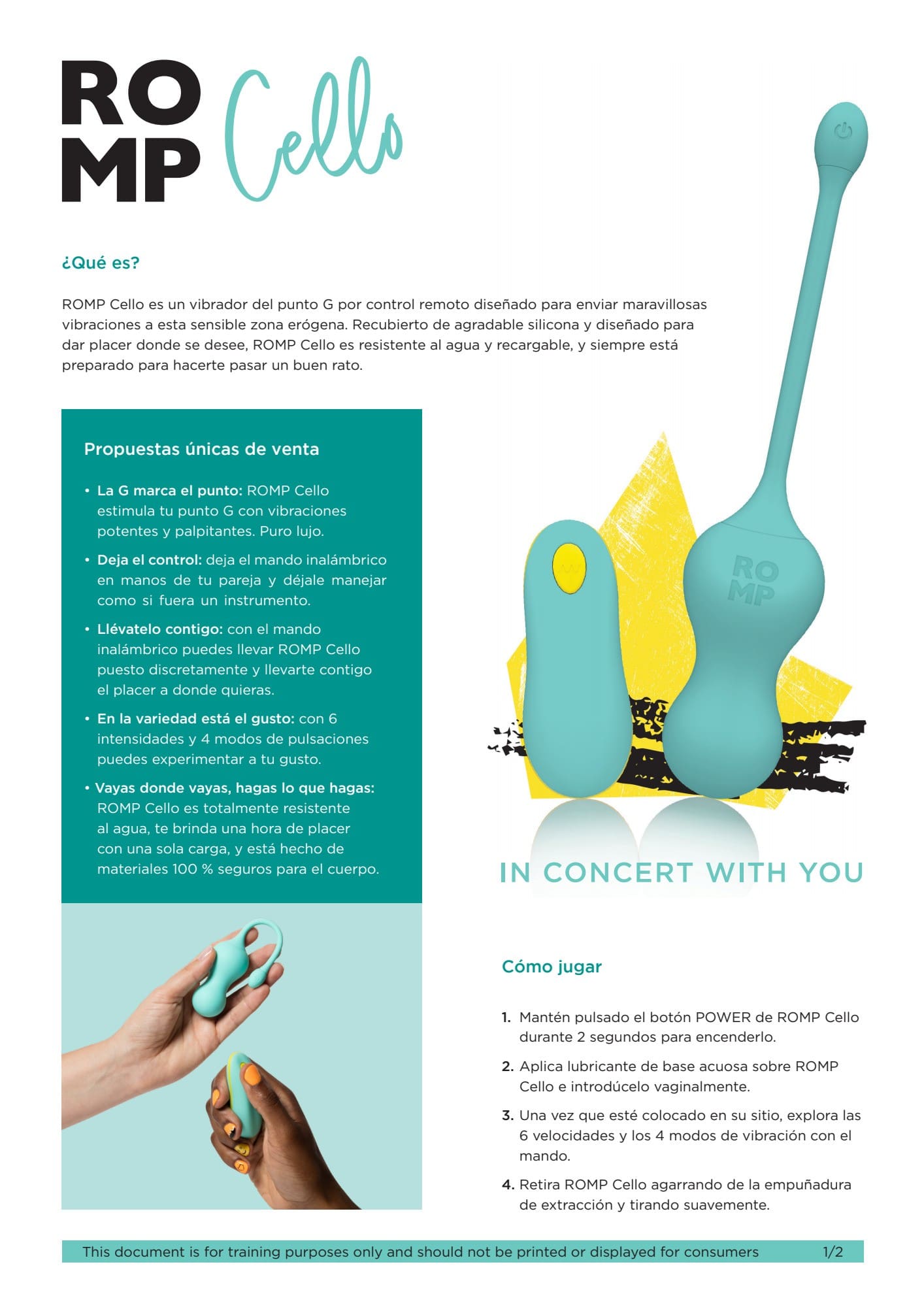 • Vayas donde vayas, hagas lo que hagas: ROMP Cello es totalmente resistente al agua, te brinda una hora de placer con una sola carga, y está hecho de materiales 100 % seguros para el cuerpo