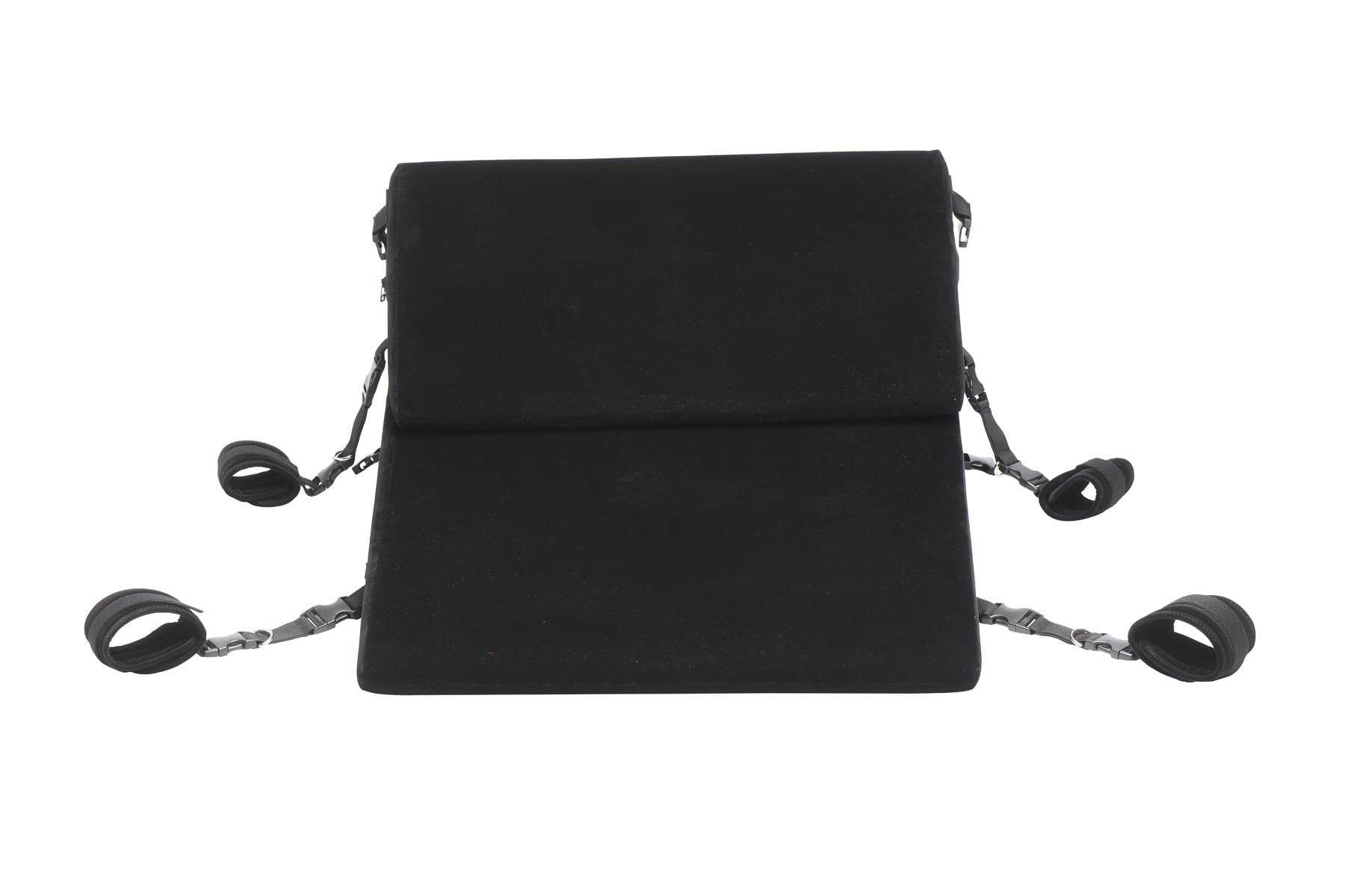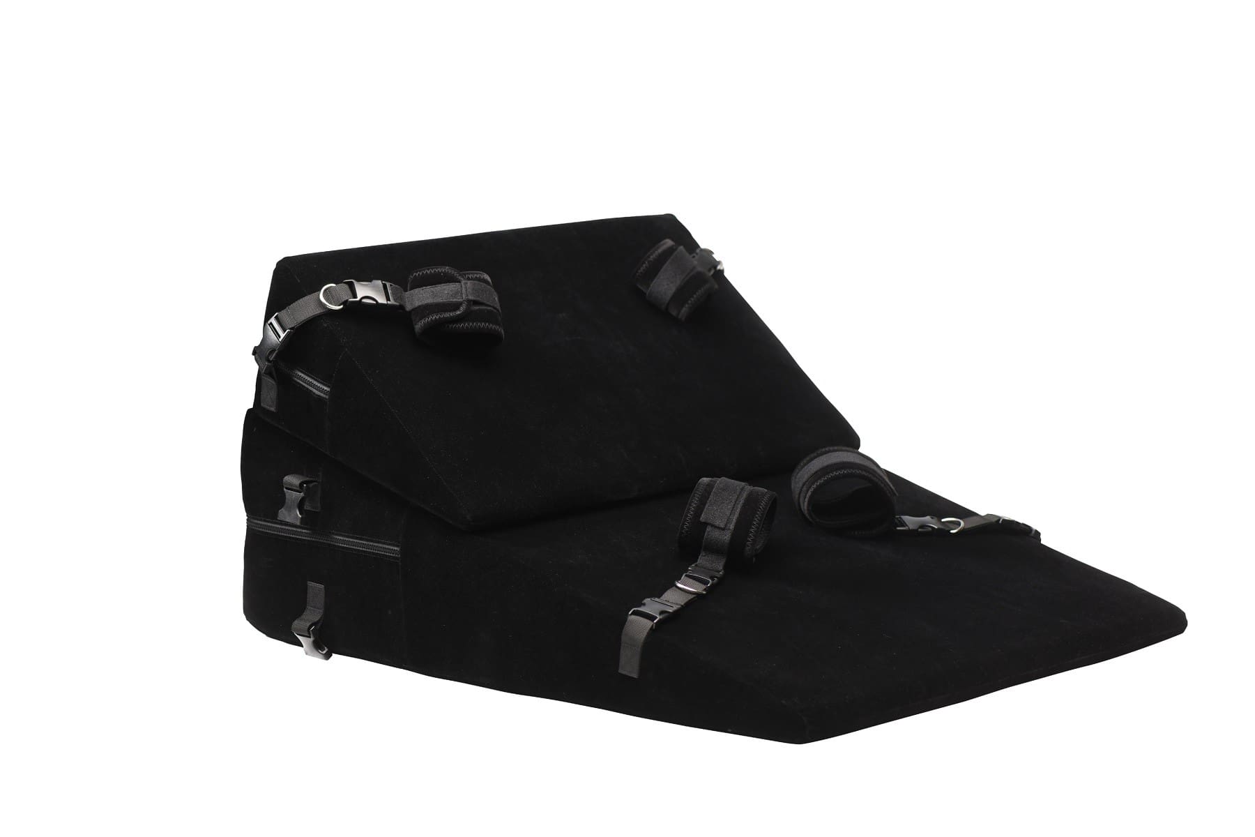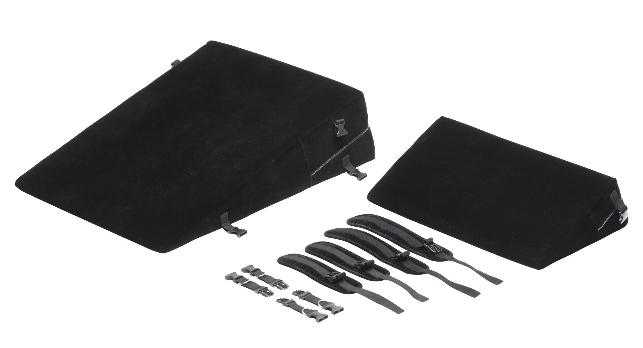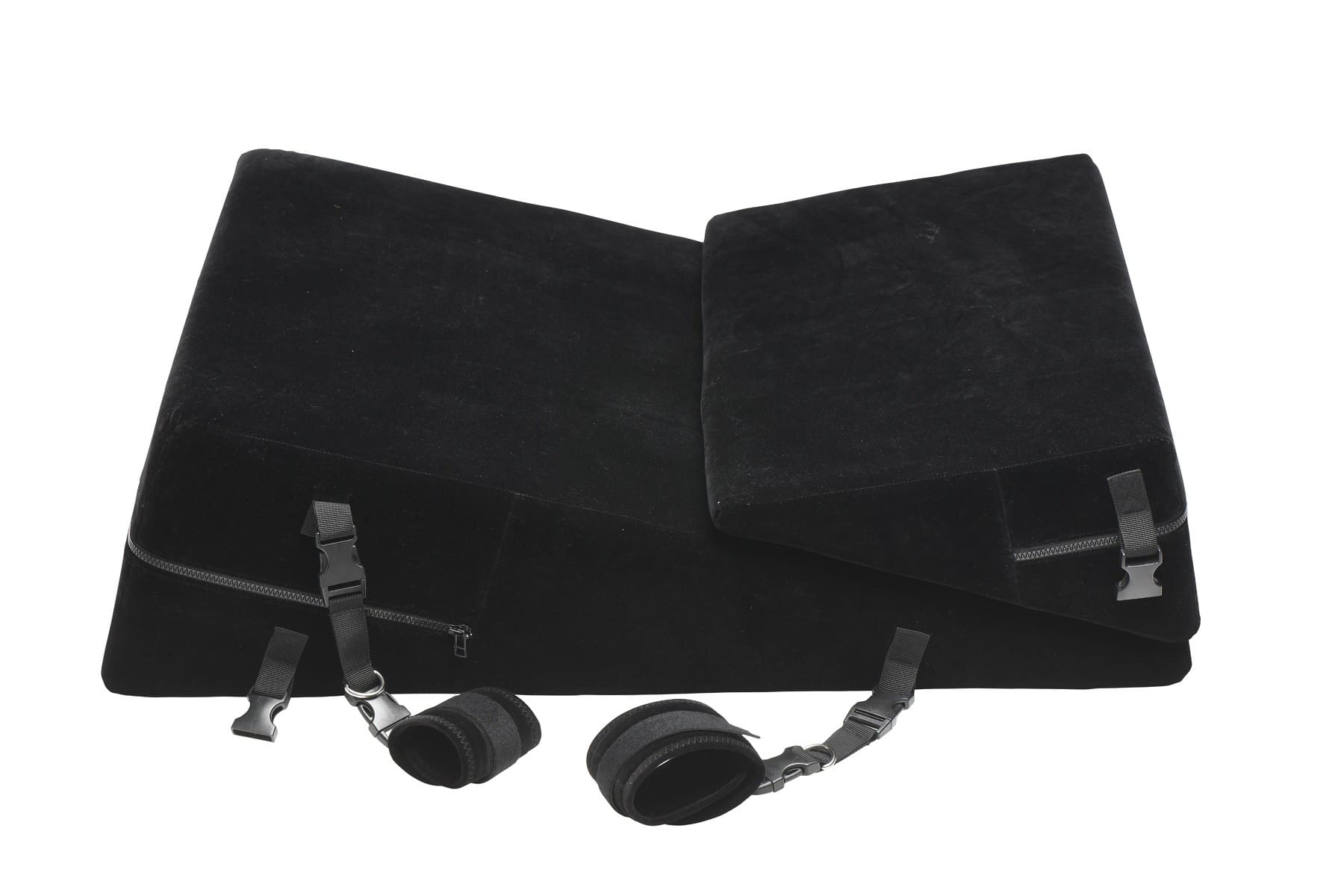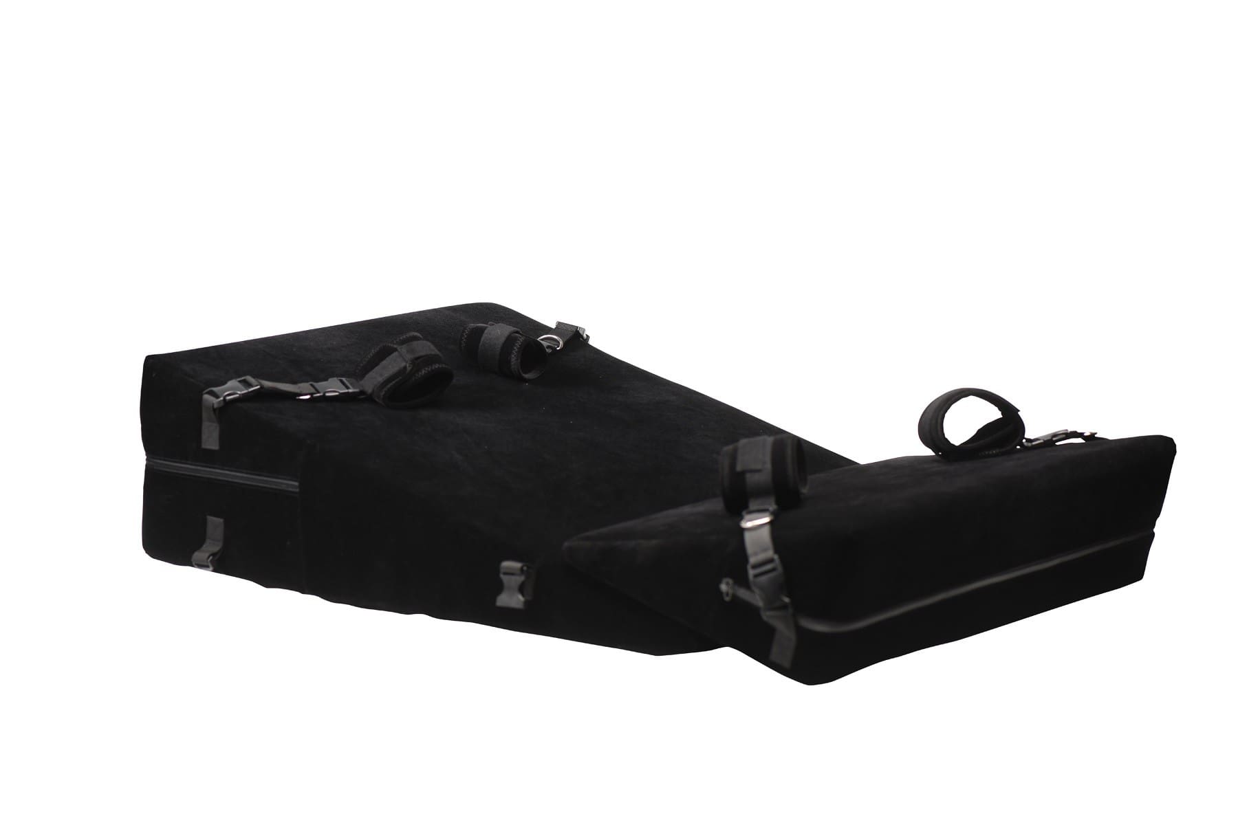 Este juego de almohadas bondage incluye 2 muñequeras, 2 tobilleras, 4 conectores con anillos en D y 2 conectores de sujeción. También hay clips incorporados para sujeciones u otros accesorios. Coloque las muñecas y los tobillos de su amante en la cuña de la almohada. Cuando se tumban o se apoyan en la cuña, su propio peso corporal se convierte en el ancla que los mantiene atados. Levanta sus caderas para acceder fácilmente a su punto G o P, gíralos y juega con ellos en posición de perrito, ¡o apoya tus propias rodillas mientras te arrodillas con ellos! El tacto aterciopelado de la suave cubierta exterior añade sensualidad a tu sesión kinyk. ¡Las cuñas también son livianas para que puedas viajar fácilmente con ellas para pasar la noche y fiestas!